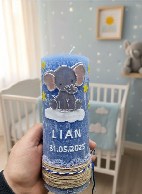 Süße Kerze mit Elefant zur Taufe oder Geburt mit Wachsverzierung und Rustikkerze