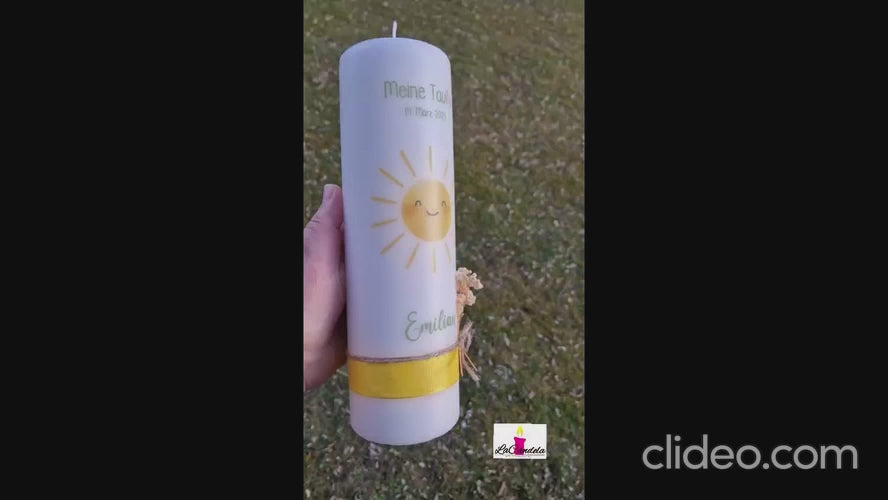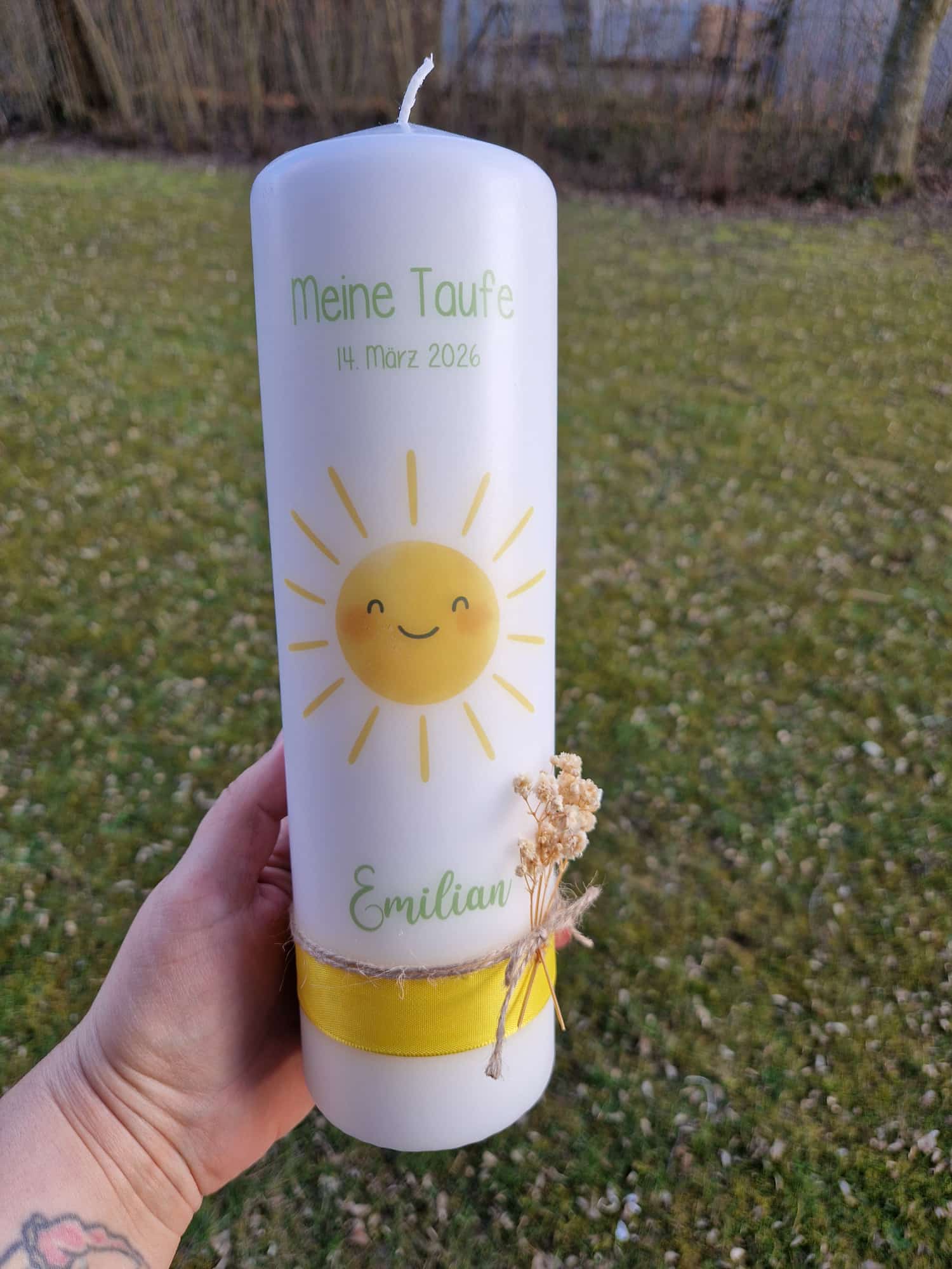 Taufkerze Sonne mit Trockenblumen